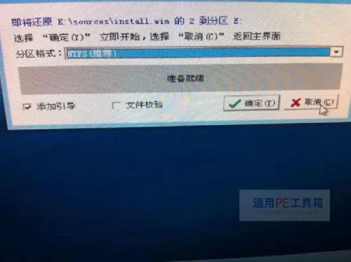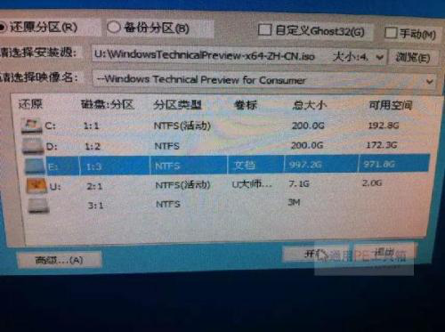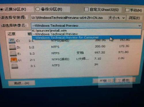5、然后如下图所示,在“请选择映像名”那里下拉框有3个选择,第一个是无用的,第二“windows technical preview”的意思是 windows 技术预览版,而第三个“windows technical preview for consumer” windows 消费者技术预览版,目前通用pe工具箱只支持消费者技术预览版,所以我们选择第三个,然后设置好安装的路径,点击开始,然后再点击确定即可开始安装了。